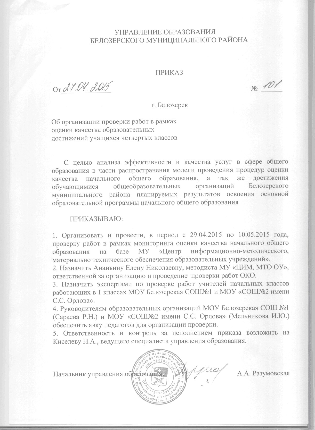 Приказ №101 от 27.04.2015